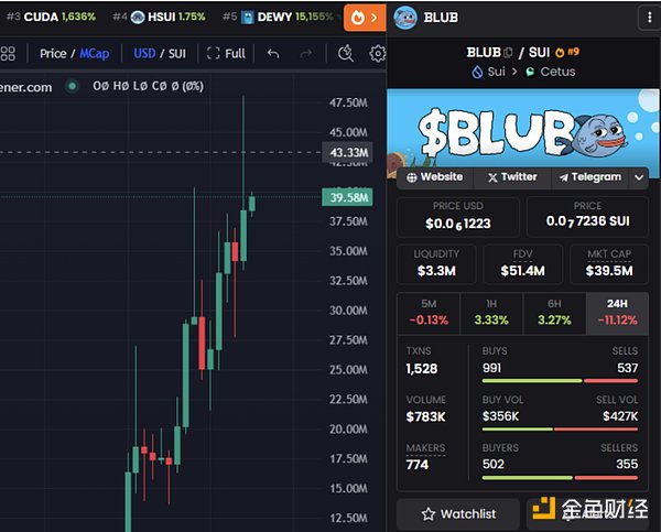有意思的是,BLUB 的代币发行时间为 9 月 1 日,与 SUI 起涨点时间相近,也从开盘时的 350 万美元市值上涨至最高 4800 万美元市值,达成 11 倍涨幅,