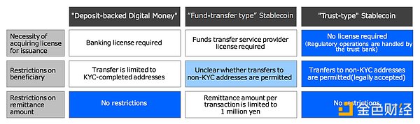 在这些发行实体中,最引人注目的类型可能是由信托公司发行的信托型稳定币。这是因为它们预计与日本当前的监管环境最为兼容,并且在特征上与 USDT 和 USDC 等常见稳定币非常相似。