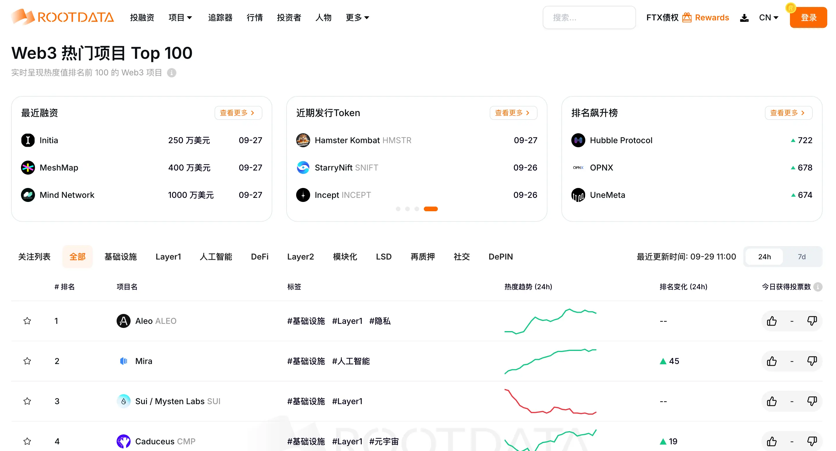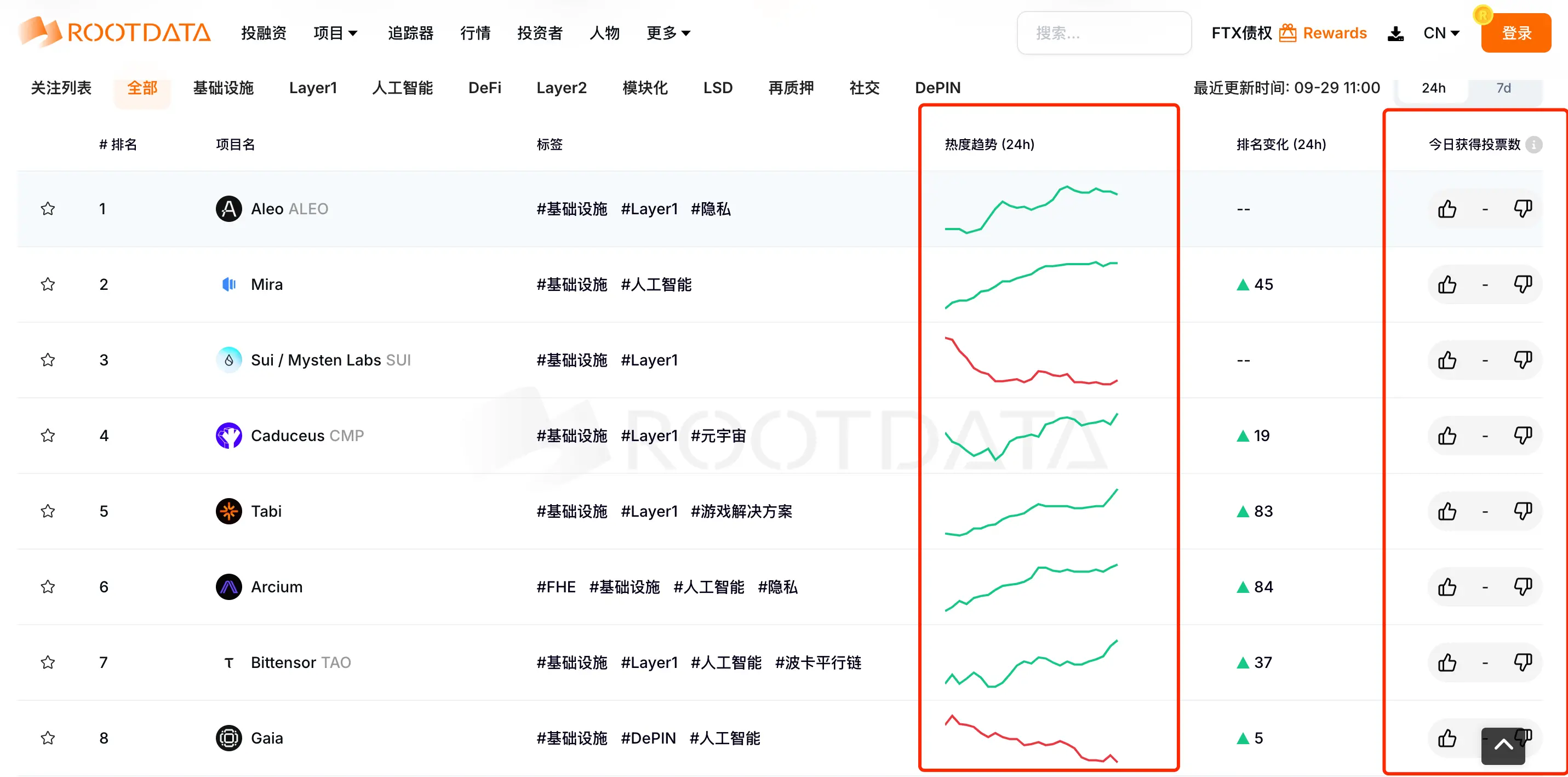 相比之下,RootData 的 “ Web3 热门项目排行榜”以每小时更新,不仅对市场情绪反应的更及时,且较早期项目也不会被忽视。