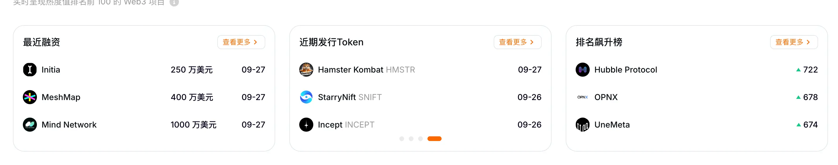 除了参考热度排名或“ 24h 热度趋势曲线”等情绪指标外,用户还可以通过查看近期融资、近期项目动态等实时更新的细分列表,以防止错过任何关键节点。