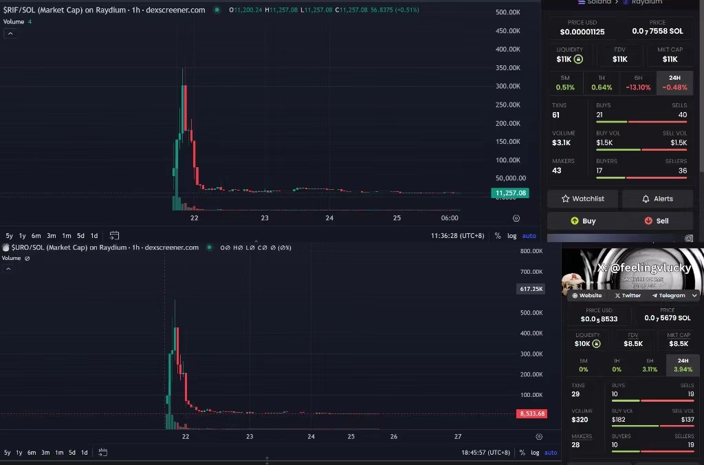 目前,Pump.Science 仅上线了两个代币,分别是尿石素($URO)和利福霉素($RIF),用户可以通过这两种代币参与实验结果的预测与交易。$RIF 代币和$URO 代币在 9.21 日晚上线,两个代币上线后两个小时内涨幅 20 倍,但随即快速下跌超 90%,最近 24 小时内仅有 29 笔交易。