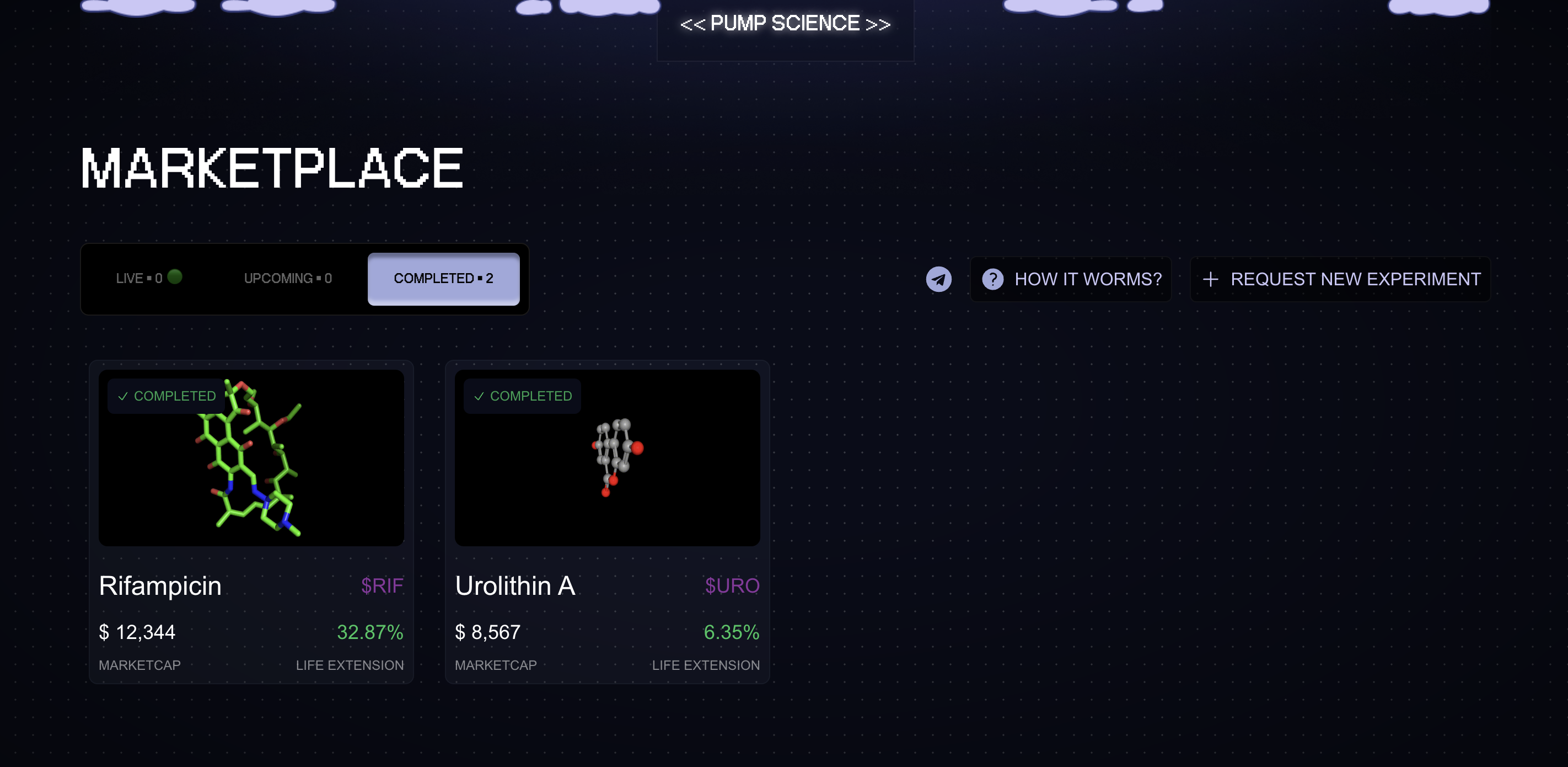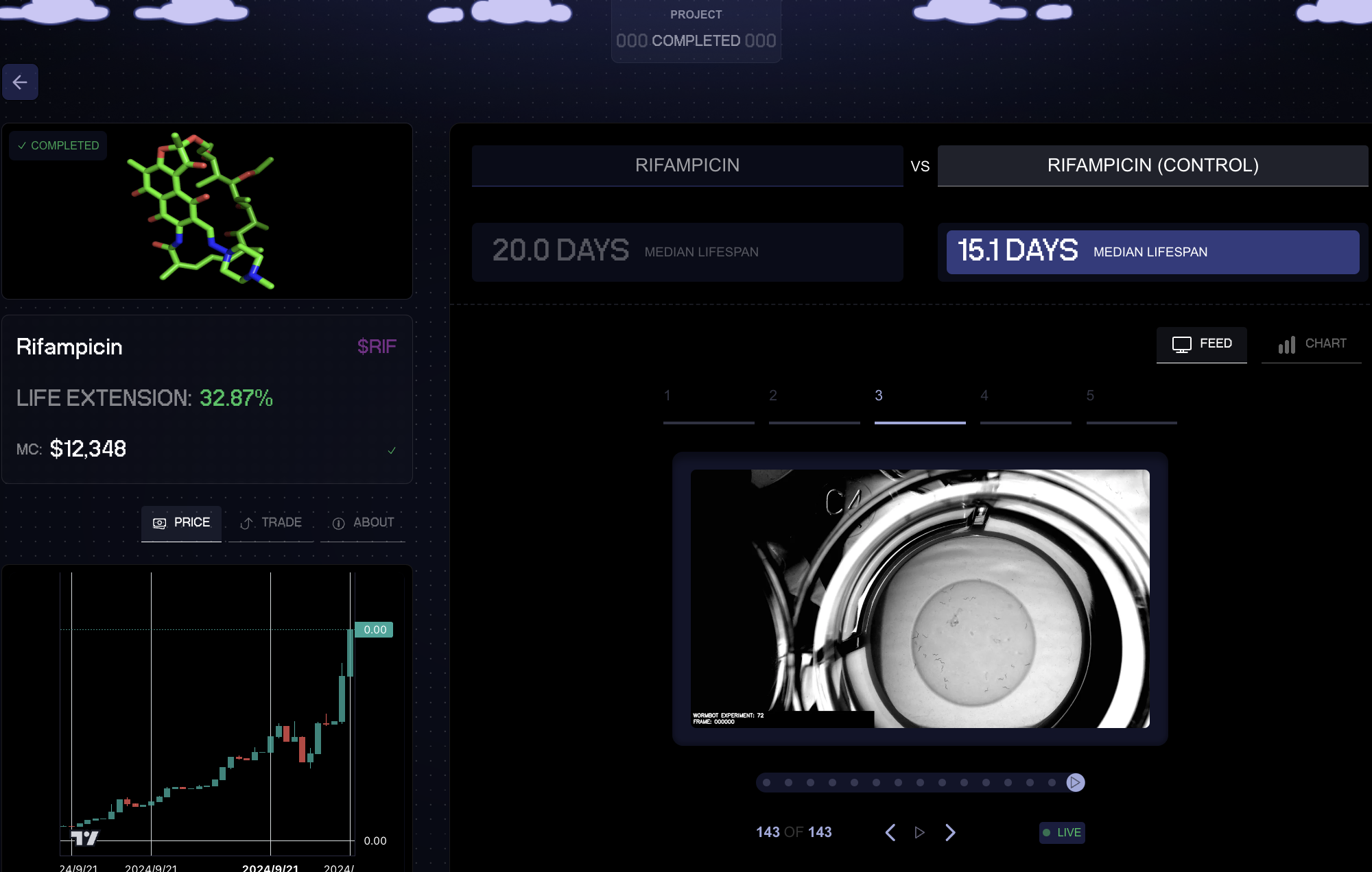 进入 Pump.science 界面,即可看到 Marketplace(市场)页面,展示了已经完成项目的实验效果和价格曲线,方便用户进行比较。点击其中一款实验项目 Rifampicin 后,系统展示了该化合物的实验结果与市场数据。与对照组蠕虫相比,Rifampicin 显示出 32.87% 的寿命延长效果,更高的「寿命延长百分比」(PLE)意味着更大的潜在收益,激励用户积极参与。