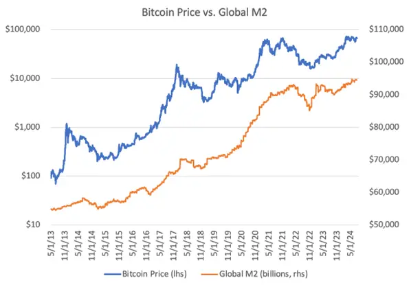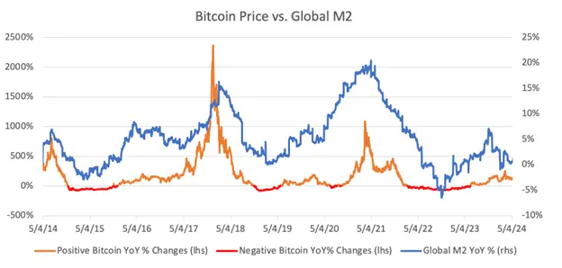 下图清楚地显示了比特币的价格如何追踪全球流动性的变化。