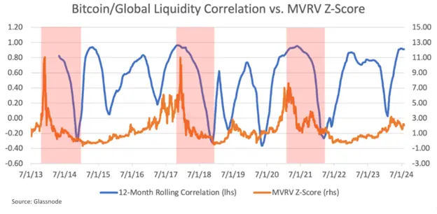 当 MVRV Z 分数与比特币全球流动性之间的 12 个月滚动相关性叠加时,一种模式开始显现。当 MVRV Z 分数从历史高位急剧下降时,12 个月滚动相关性似乎会失效。红色矩形表示这些时间段。
