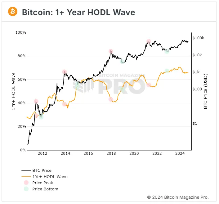 评估这种行为的一个关键指标是比特币 1 年以上持有波动,它衡量长期持有者(至少一年)持有的比特币数量占总流通供应量的百分比。换一句话来理解,它衡量的是长期投资者在任何特定时间点持有的总可用供应量的百分比。