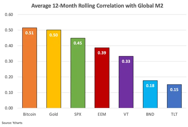 这表明,尽管相关性的强度可能因时间范围而异,但比特币的价格走向通常与全球流动性的方向一致。此外,它的价格走向比所分析的任何其他传统资产都更接近全球流动性。