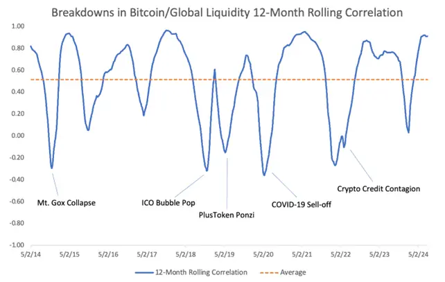 下图说明了比特币与流动性的相关性在重大行业事件期间脱钩。