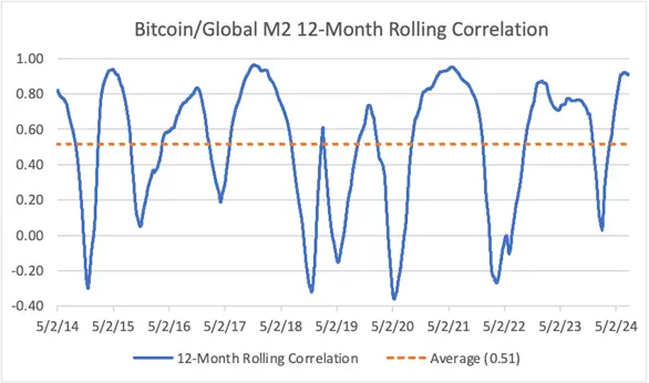 从 12 个月的滚动相关性来看,比特币与全球流动性的平均相关性下降至 0.51。这仍然是一种正向相关性,但明显低于整体相关性。
