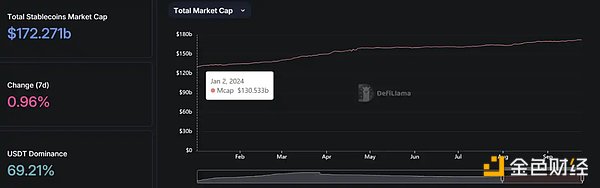 根据 DeFiLlama 数据显示,2024 年以来稳定币整体市值已从 1300 亿美元成长至目前 1720 亿美元,年内涨幅高达 32%。
