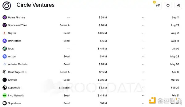 Circle Ventures 在 2024 年一共投资了 12 笔项目,一个月投资 1~2 个项目,投资项目类型多为支付、RWA 赛道,以及一些零星的基础设施。像是近期融资 3800 万新兴概念 PayFi 龙头 Huma Funance、RWA 信贷市场 Centrifuge 等。