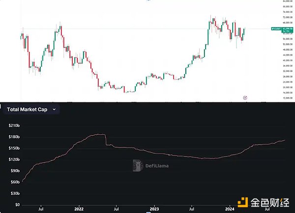 2023 年至 2024 年,比特币价格和稳定币市值均呈现逐渐上升的趋势,暗示着市场重新恢复兴趣,资金再次流入加密货币市场。