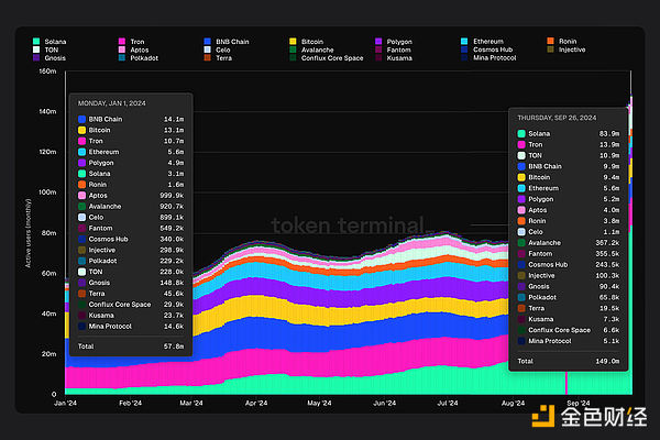 随着季度接近尾声,MAU图表显示出集中度的提高,目前Solana占前20大L1链的56%。这一增长主要是由memecoin热潮推动的,但到了第三季度末,热潮开始降温。