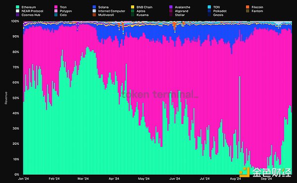 在收入方面,由于 Dencun 之后的费用影响以及 Solana 和 Tron 上活动的增加,我们看到了重大变化。在 Dencun 之后,以太坊超声波货币理论明显崩溃,8 月底,以太坊的收入份额跌至 5% 以下。
