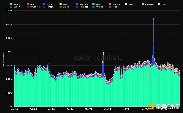 全年来看,L1 链上的交易活动保持相对稳定,Aptos 经历了两次显著的交易高峰。然而,交易活动的构成发生了一些结构性变化。