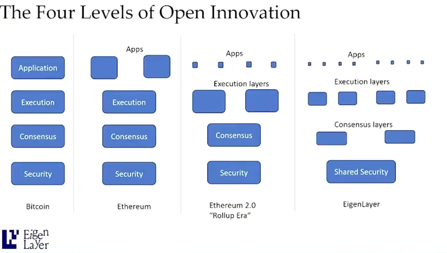 除了基础的 Layer1 竞争外,我也很喜欢模块化叙事,模块化是这轮周期被讨论比较多的新叙事。其实看下面这张图就好了。