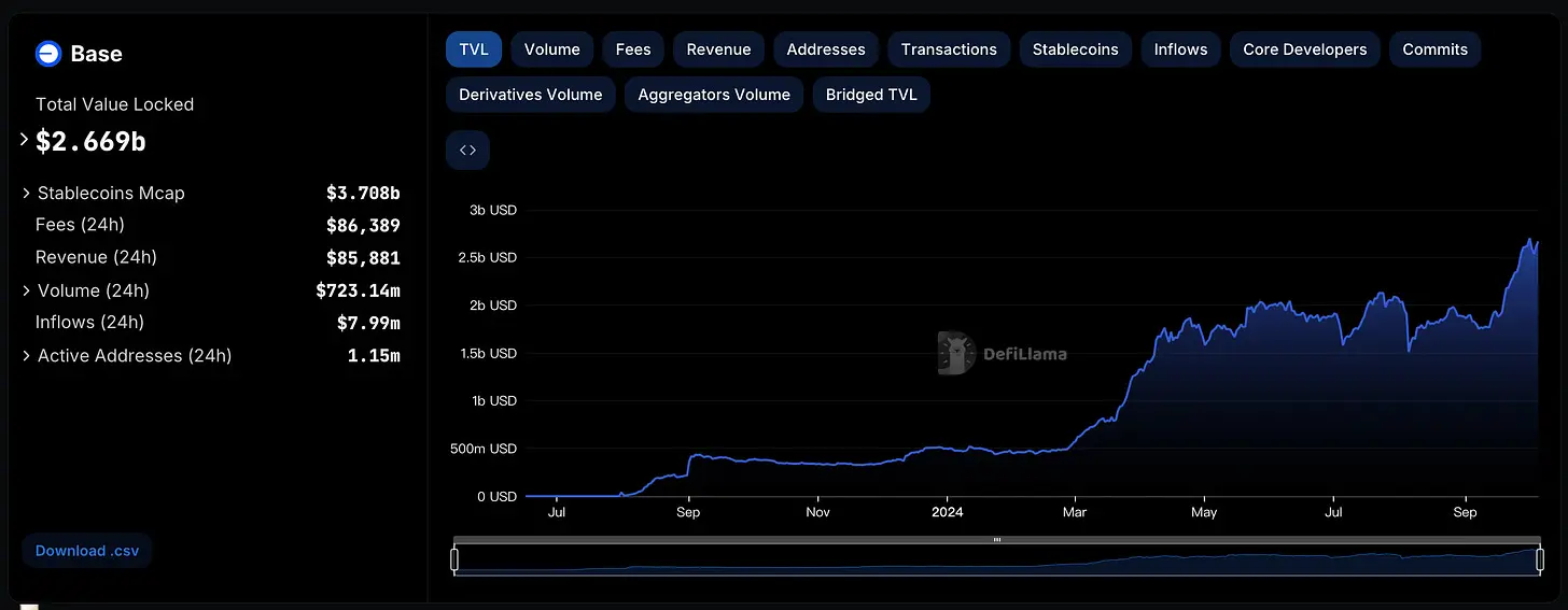 这里我想单独提一下以太坊 Layer2 Basechain。Base 最近表现很好,TVL 在 9 月涨了很多,基本面的增长会带来新的财富机会。这里我们需要明确 Coinbase 做 Basechain 的需求:Base 能够拓展 Coinbase 在加密行业的影响力,还能够为 Coinbasse 带来排序器收入。Base 好,Coinbase 就会受益,那么 Coinbase 就完全有动力去推动 Base 生态的持续增长(之前拉盘 $AERO 也是这个道理)。