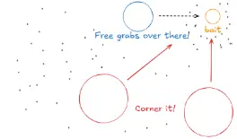 诱饵策略:玩家可以生成一个大小为100的诱饵小球,并布置几个大小为500的捕食球体,然后将捕食球体置于追捕诱饵小球的敌人路径上。