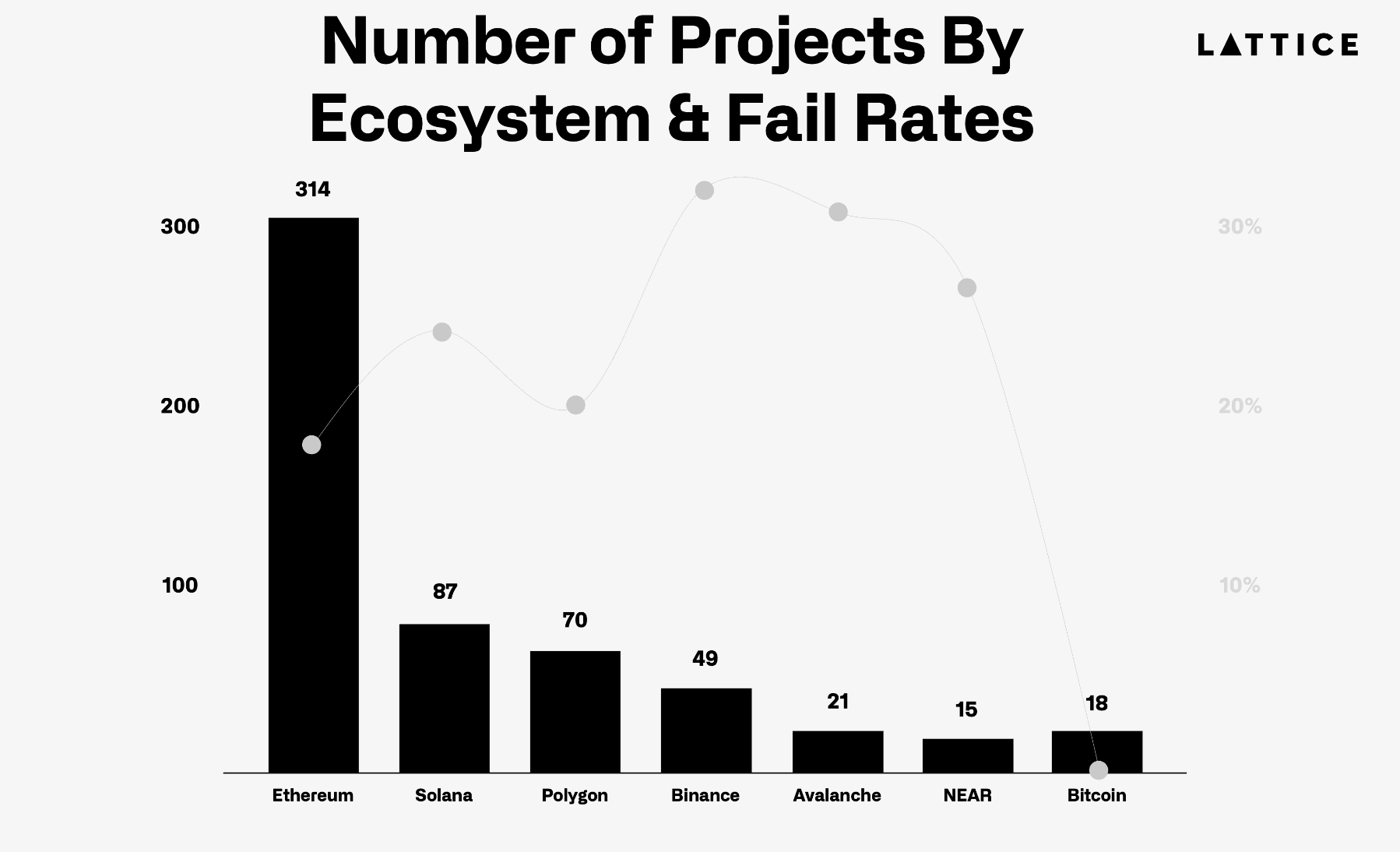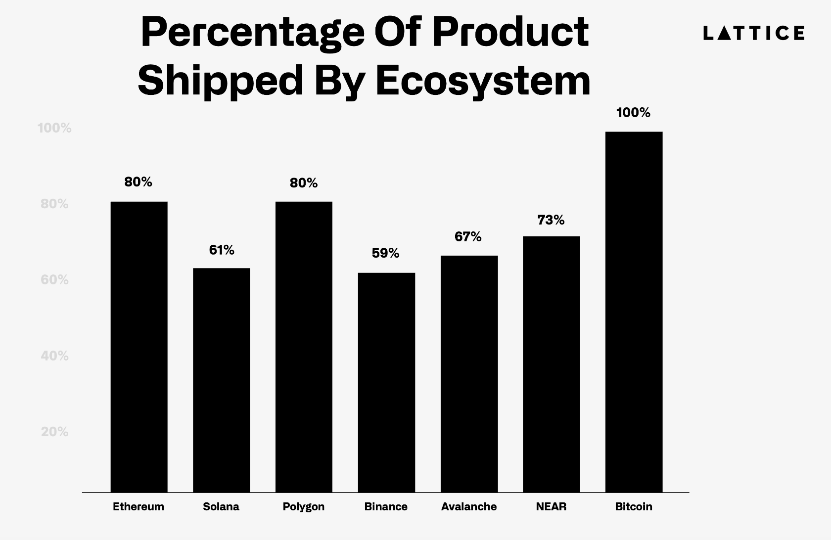 跨生态系统的开发揭示了项目成功率的显著差异。近 80% 的基于以太坊的项目已经交付了产品,表现优于 Solana,后者只有 61% 交付了产品,较 2021 年的 75% 有所下降。尽管 Solana 显然很好地度过了熊市,但 2021 年底资本的大量涌入可能导致资金过剩。