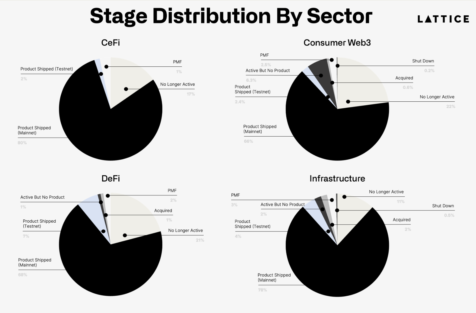 (注:Lattice 的配图,将从左到右将被分析的产品分为活跃但未交付、产品交付、有 PMF、有代币、不再活跃、被收购和关停等几个阶段)