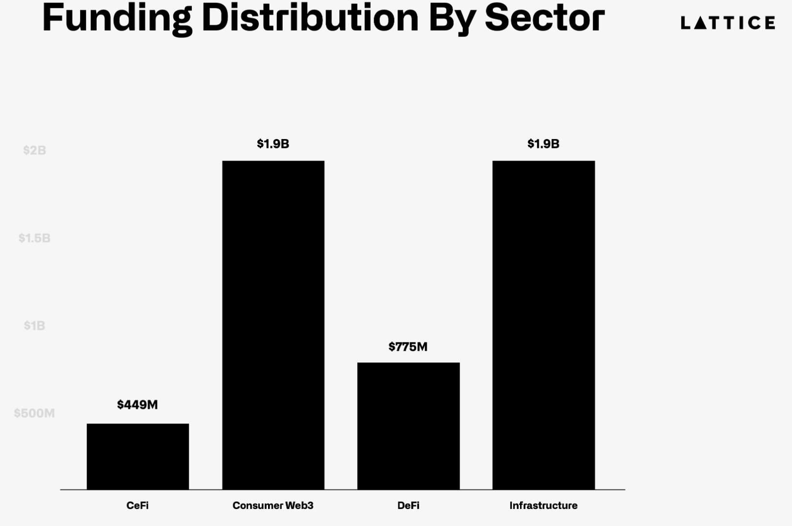 ·在经历了 2021 年的绕行之后,投资者回到了基础设施和 CeFi 等更经过验证的一致领域,分别向这些领域投入了近 20 亿美元和近 4.5 亿美元,分别比 2021 年的数字增加了 3 倍和 2 倍。