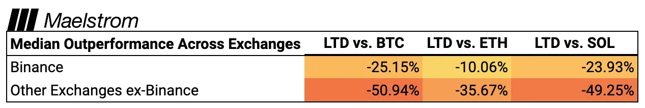 回到上面的表格,Binance 上市的代币虽然在相对基础上表现优于其他主要交易平台,但在绝对基础上,代币价格依然下跌。因此,Binance 上市并不保证代币价格会上涨。