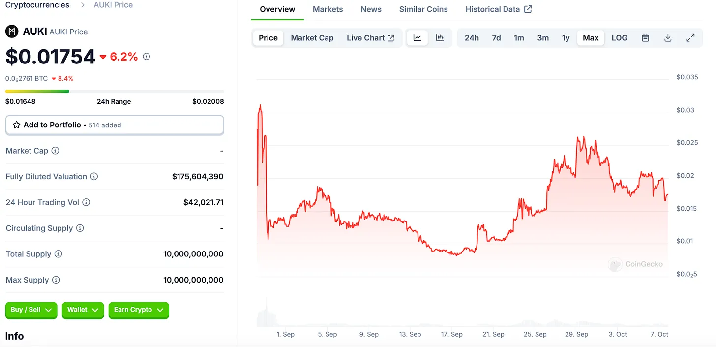 让我们来看看 Auki Labs 在发行代币时做了什么不同的尝试。上面是来自 CoinGecko 的截图。正如你所看到的,Auki 的 FDV 和 24 小时交易量都相对较低。这是因为它首先在 DEX 上上市,随后才在 MEXC 的 CEX 上市。到目前为止,Auki 的代币价格比上一轮私募价格上涨了 78%。