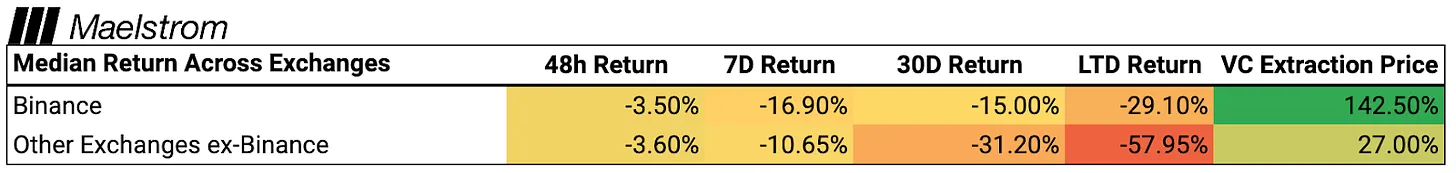 这告诉我们,项目在上市时必须将估值降低 40% 到 50%,才会在相对基础上变得有吸引力。谁会在代币以更低价格上市时受损?VC 和 CEX。