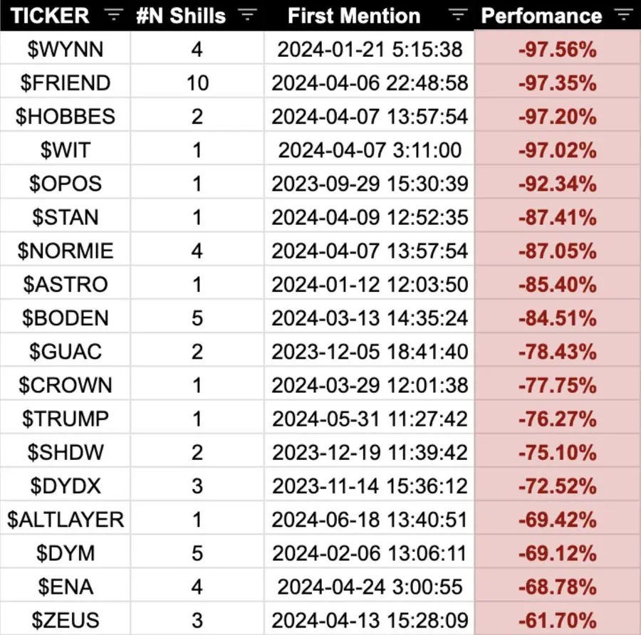 这不仅仅是吹嘘:这是关于信念。另一方面,Ansem 仅提到 1-2 次的代币则全部呈现 100% 的负回报。典型的拉升出货行为。