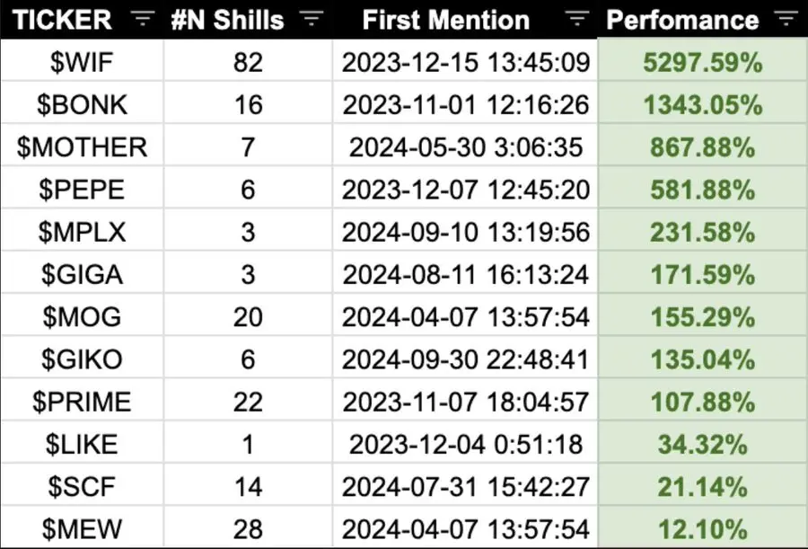 如果你在每个代币首次被提及时买入,那么你的平均回报率大约是 150%。表现最好的代币有: