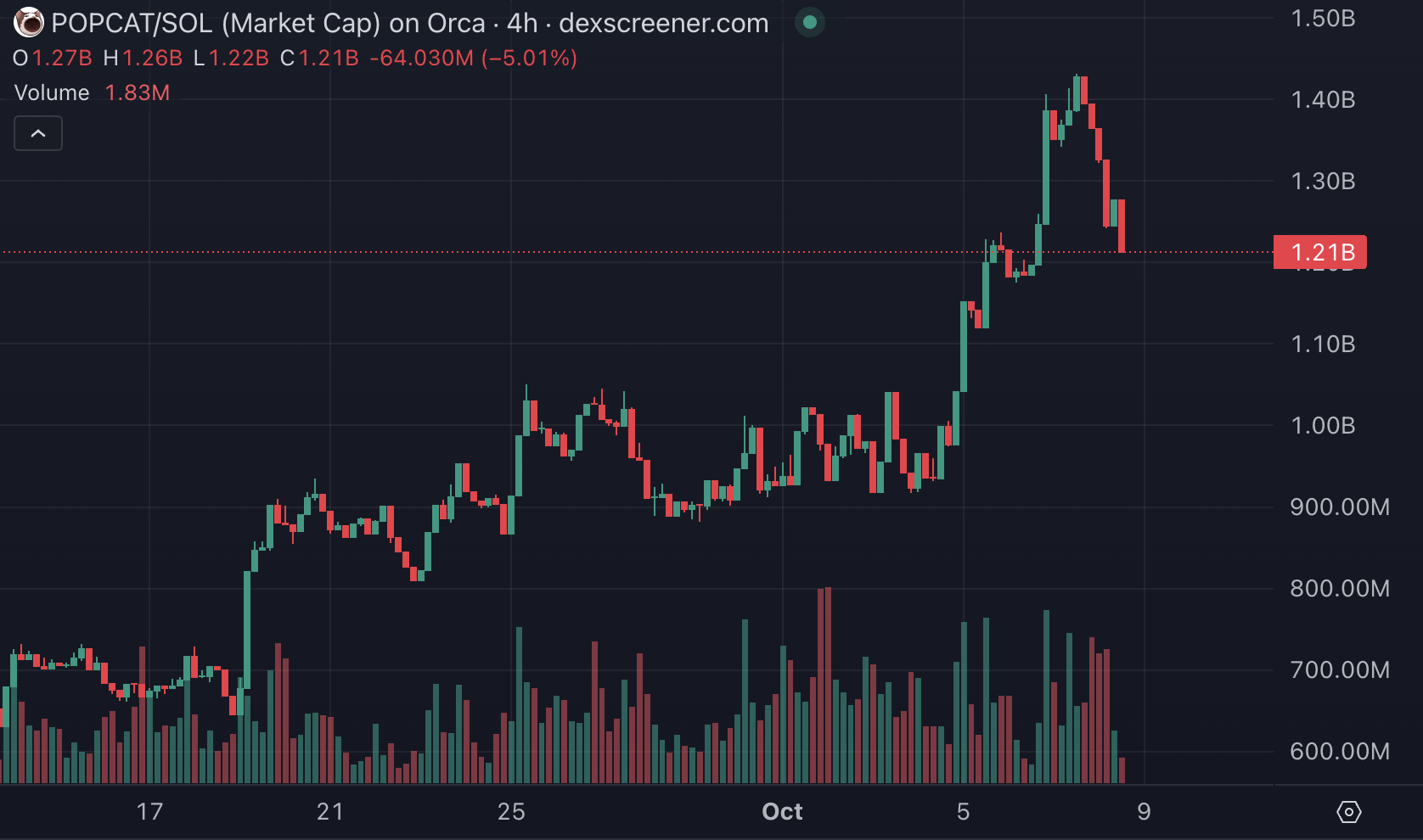 10 月 7 日,Solana 链上 Meme 币 POPCAT 突破 1.46 美元,市值达 14.2 亿美元创历史新高。截止撰稿时,POPCAT 市值为 12.1 亿美元,在 meme 币板块中排名第七。