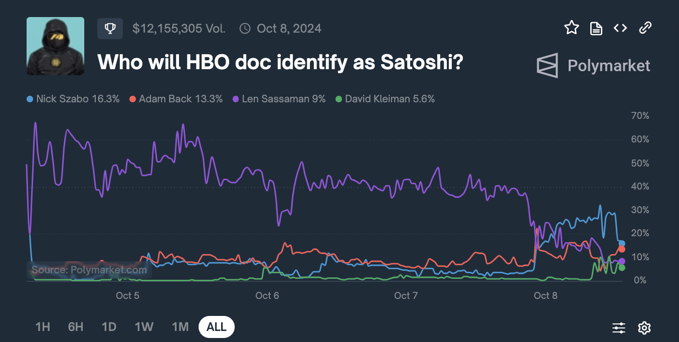 该片由艾美奖提名者、《Q:走进风暴》导演卡伦·霍巴克 (Cullen Hoback) 执导。目前 Polymarket 上用户认为 Len Sassaman 将会是这部纪录片中所揭示的「中本聪」。据悉,Len Sassaman 在与抑郁症斗争后于 2011 年自杀,因为他长期发表有关密码学的学术著作,这些著作常常显示出他对隐私和去中心化的坚定意识形态承诺,所以有人认为他就是中本聪。