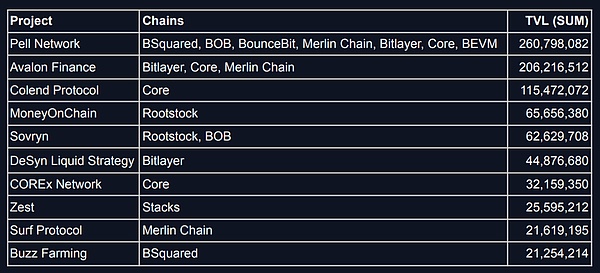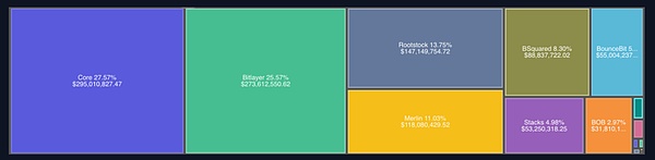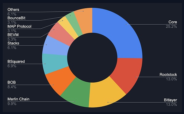 Core领先,拥有27.6%的总锁定价值(TVL),紧随其后的是Bitlayer,占25.6%;Rootstock占13.8%;Merlin Chain占11.0%。