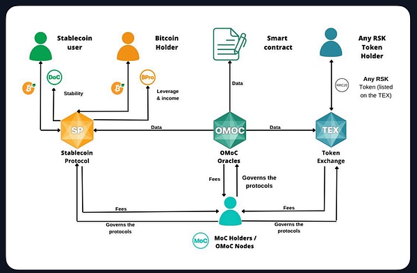 该协议的架构基于风险共担机制,采用专有的金融模型,以应对极端市场波动。同时,它还包括去中心化的Token交易平台(TEX)、去中心化预言机(OMoC)以及治理Token(MoC),使用户能够参与协议决策、质押并获取奖励。