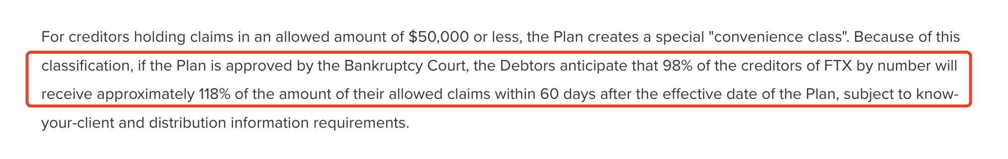 根据破产计划,FTX 将依照 2022 年 11 月破产之时的债权美元价值,以现金形式先对 98% 的债权人进行赔付,预计赔付比例为 118% ;剩余债权人也将获得 100% 的赔付比例,外加总额高达数十亿美元时间价值补偿。