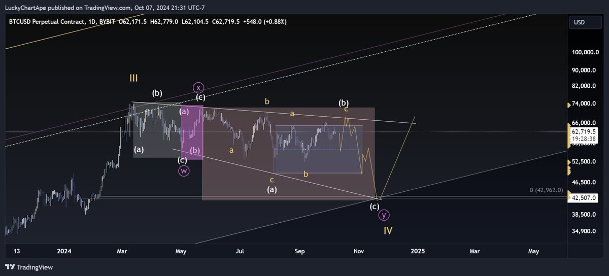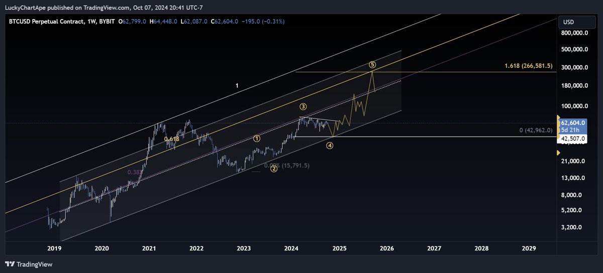 @luckychartape 认为 BTC 还是处于一个牛市周期中,第四浪在向下寻找到 42,000 美元的支撑之后,会开启第五浪,最终目标会到达 260,000 美元的价格区间。