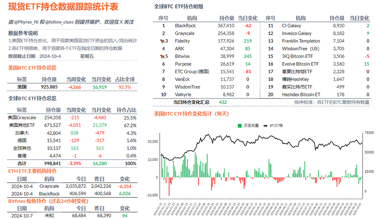 @Phyrex_Ni 从 BTC ETF 的角度出发,在过去的一周中净流出了 3394 枚 BTC,结束了连续三周的净增持,其中有 4265 枚 BTC 是从美国的十二家 ETF 机构中流出的,上一周唯一四位数的增持只有来自贝莱德的 2100 枚 BTC,购买力下降十分的明显,目前并没有大量的抛售,所以 BTC 的价格更多的还是和宏观情绪挂钩,除非有非常明显的利空,否则对于价格的压力不是很大。