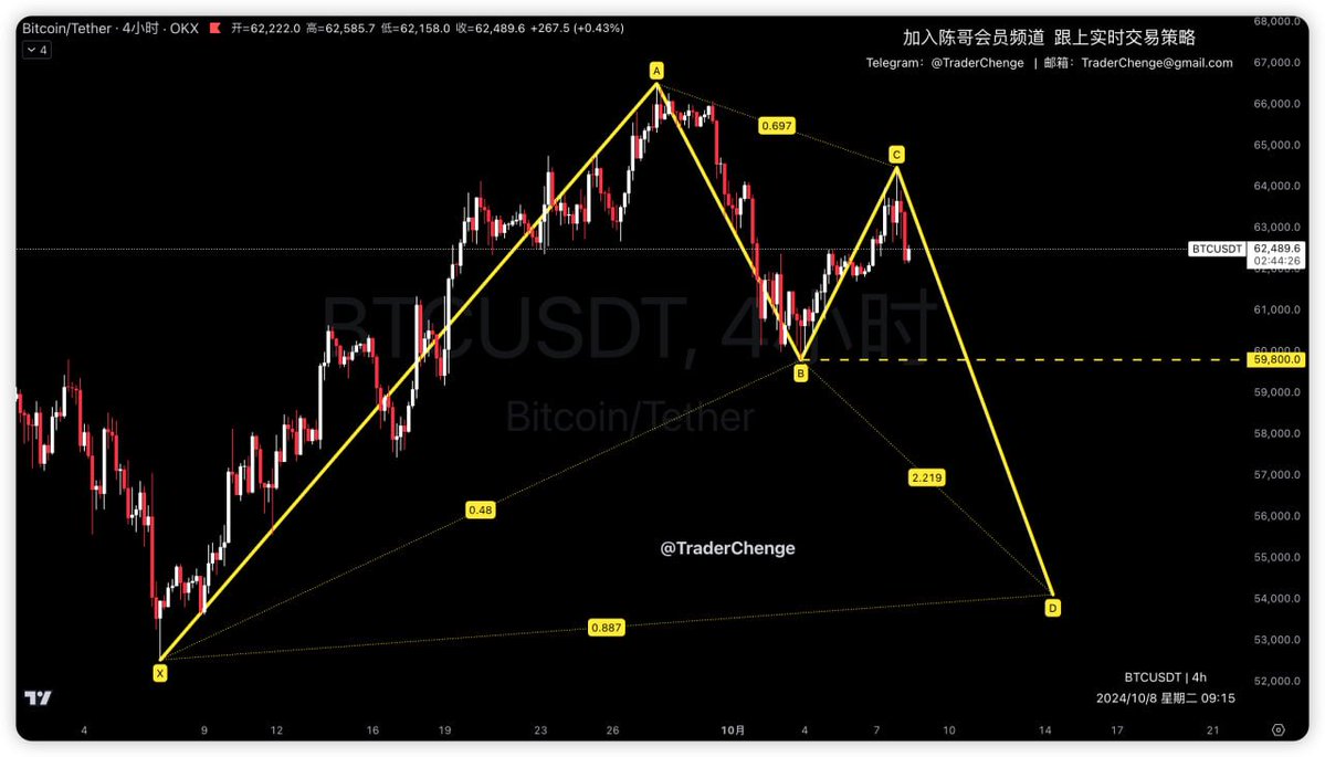 @TraderChenge 认为如果行情跌破 59800 美元,有可能会去完成这样的潜在蝙蝠形态,继续走一波下跌行情?不过在行情没有跌破 59800 美元之前,我是不会看跌的,没有跌破 59800 美元之前我的操作思路必然是低位接多。短线行情是多变的,需要持续关注这个潜在的蝙蝠形态。