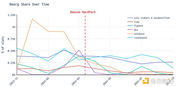 自 Dencun 以来,独立质押者和无法识别的节点的重组率有所下降。