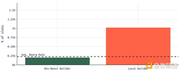 本地构建者遭遇重组的可能性大约是 MEV-Boost 构建者的 5 倍。