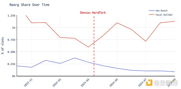 而对于 MEV-Boost 用户,自 Dencun 以来,重组率一直呈下降趋势。