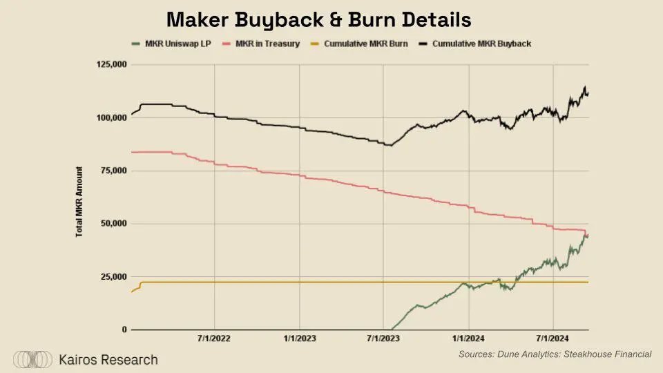 在整个 2024 年,Maker 有望产生约 8840 万美元的净协议收入。MKR 的估值为 16 亿美元,仅为净收入的 18 倍。2023 年,DAO 投票决定修改协议的代币经济学,将部分收益返还给 MKR 持有者。随着 DAI 持续将借款利率(稳定费)累积到协议中,Maker 积累了系统盈余,他们的目标是将其保持在 5000 万美元左右。Maker 引入智能销毁引擎,利用盈余资金在市场回购 MKR。 根据 Maker Burn,11% 的 MKR 供应量已被回购并用于销毁、协议自有流动性或金库建设。