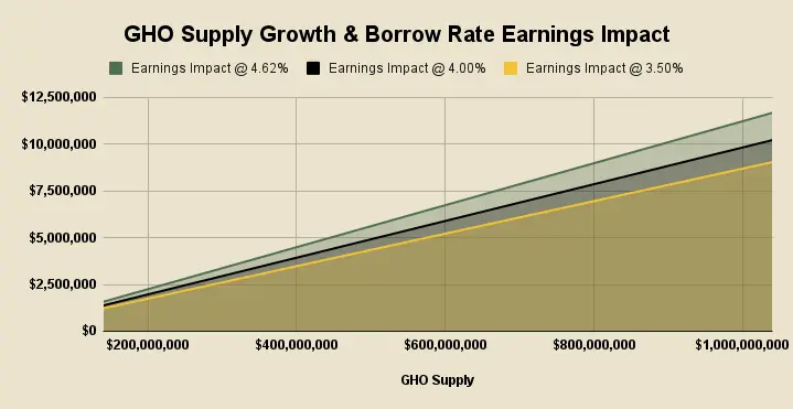 目前,GHO 供应量为 1.42 亿,GHO 的加权平均借入利率为 4.62%,加权平均 stkGHO 激励支出为 4.52%,其中 77.38% 的总 GHO 供应量质押在安全模块中。因此,Aave 在价值 1.1 亿美元的 GHO 上赚取 10 个基点,在未质押的 3200 万美元上赚取 4.62%。考虑到全球利率趋势和 stkAAVE 折扣,GHO 借入利率当然有降至 4.62% 以下的空间,因此我们还增加了对 GHO 影响的预测,分别为 4% 和 3.5%。未来几年,Aave 应该有很多机会促进 GHO 的增长,下图预测了未偿还 GHO 贷款达到 10 亿美元的路径将如何影响协议收益。