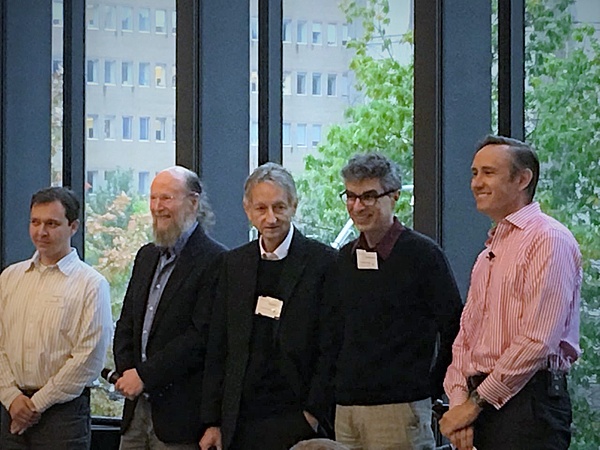 Salakhutdinov(左一)与辛顿(中),2016年
