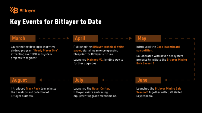 自创立以来,Bitlayer 致力于最前沿的 BitVM 和 OP_CAT 研究与开发,专注于探索比特币的潜力,并通过技术创新将可编程引入比特币系统,并专注于生态建设与用户获取。截止目前,Bitlayer 的关键里程碑事件包括: