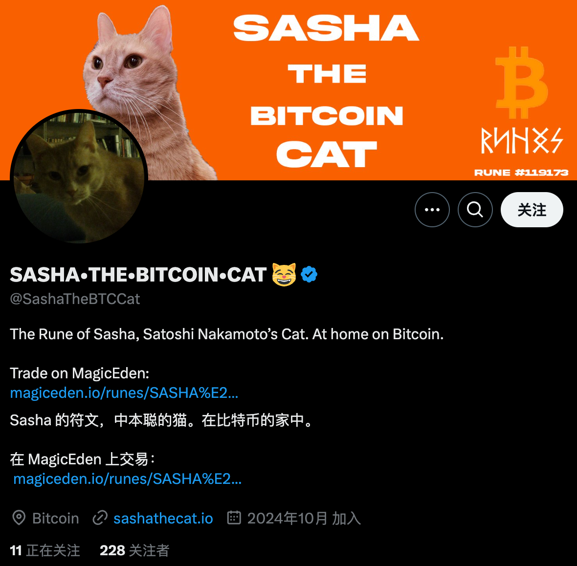 传闻中本聪的猫 Sasha,在比特币上的符文版本。