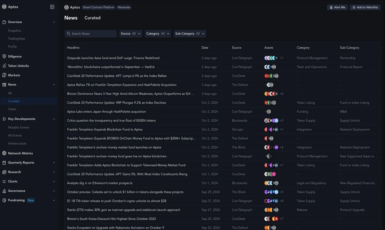 Messari 在这里是我经常使用的一个非常独特的工具。除了提供基本的基础数据外,它的独特优势在于聚合最新的动态、新闻,并提供专门的研究报告。这是我使用的少数付费研究工具之一。