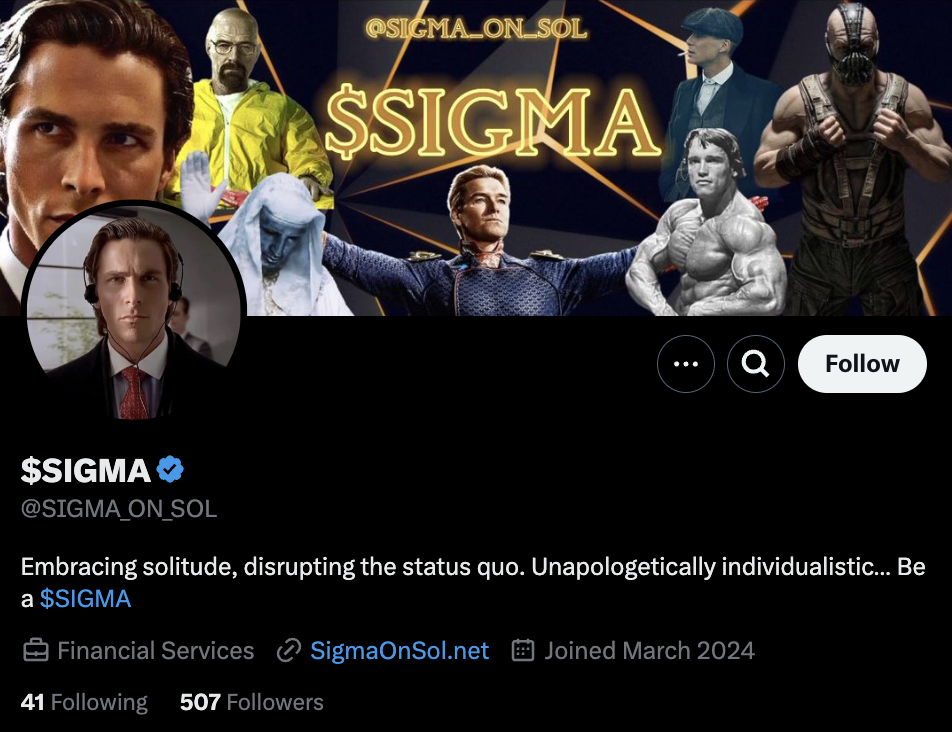 SIGMA 的概念和 GIGA 有些类似,都是一种男子气概的描述,「Sigma Male」一词最初由美国另类右翼作家 Vox Day 在 2010 年的一篇博客文章中首次创造,它描述了一种成功且受欢迎但更喜欢在传统社会等级制度之外运作的男性原型,通常被描述为寻求自我控制而不是社会统治的「独狼」。