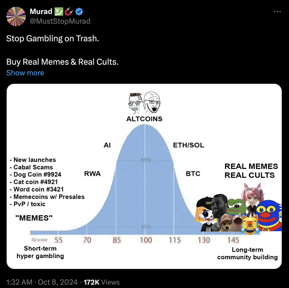 要说 Cult(邪教)文化,加密领域非比特币莫属,但如今 meme 圈也迎来了「邪教时刻」。在刚刚过去的这个小长假期间,多个老 meme 起死回生,也让许多人的钱包「起死回生」。而它们都有一个共同特点,就是披着一层 cult 文化属性。meme maxi KOL Murad Mahmudov 近段时间多次提到 Cult 文化,指那些无厘头、搞抽象的「非主流」meme 币,但是,meme 币又有什么主流呢?