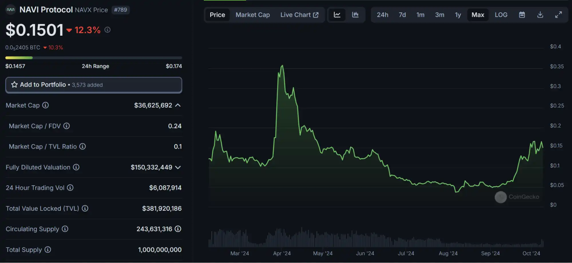 目前代币价格约为 0.15,历史新高 0.357,当前市值 3662 万。