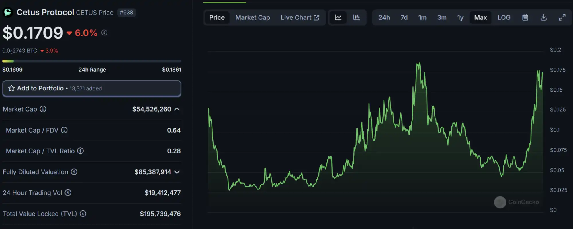 代币 CETUS 在过去 30 天价格上涨 180%,当前币价约为 0.17,距离历史新高 0.186 仅有一步之遥。当前市值为 5452 万美元,在 Coingecko 排名 638。